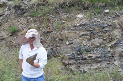 Jian-Bo Zhou of Jilin University examining a sample from the Mohe Complex of the Erguna Block, NE China, as part of a study of the Central Asian Orogenic Belt in China.