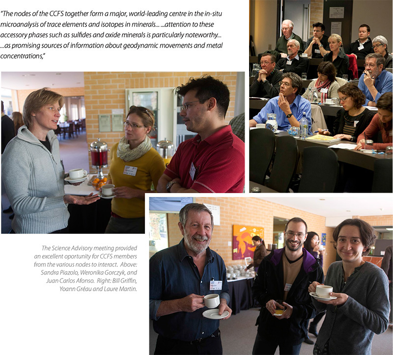 A combined meeting of all CCFS national Collaborating Institutions and the Geological Survey of Western Australia Partner was held at Macquarie University on 1-2 August 2012. Presentations were given by senior to early-career researchers and postgraduate students. The presentations were of outstanding quality, especially those of the postgraduates and early-career researchers. The Science Advisory Committee, Professors Stephen Foley, Stephen Grant and Julian Pearce, presented a comprehensive report praising the Centre structure and activities and providing some very constructive suggestions that are being implemented. Eclectic comments from the Report highlight different aspects of CCFS: