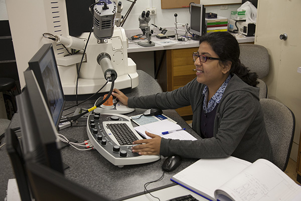 Ria Mukherjee (pictured opperating the MQ GAU Zeiss SEM) from Department of Geological Sciences, Jadavpur University, Kolkata, India: “PGE patterns and Os-isotope compositions of the base-metal sulfides and platinum-group minerals in chromitites of the Nuggihalli deposits in the western Dharwar Craton”