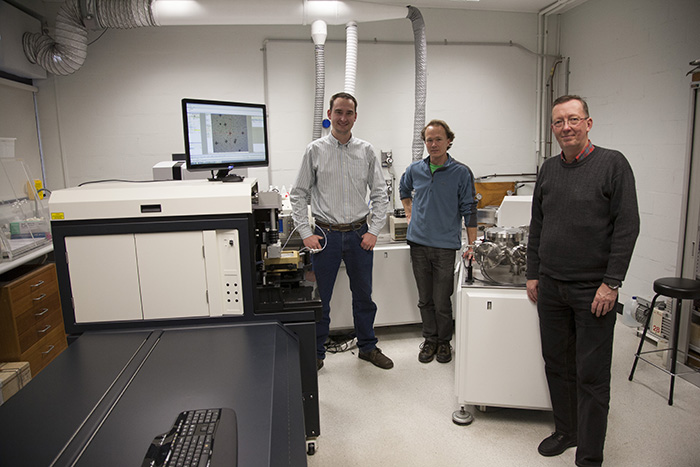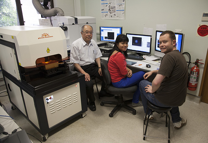 Dr Masahiko Honda (ANU/RSES), and ANU honours student Hanling Yeow with Dan Howell using the Photon Excite Excimer laser ablation system