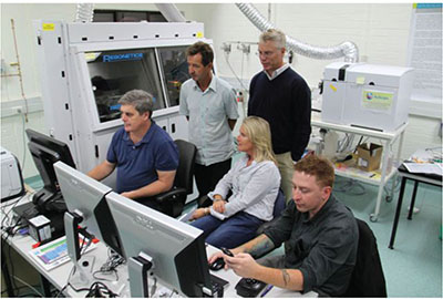 Installation of the ELA-ICP-MS instruments in the AuScope AGOS GeoHistory Facility at Curtin University. Left to right: Fred Fryer (Agilent), Brad McDonald, Noreen Evans, Brent McInnes, Mike Hamel (Resonetics).